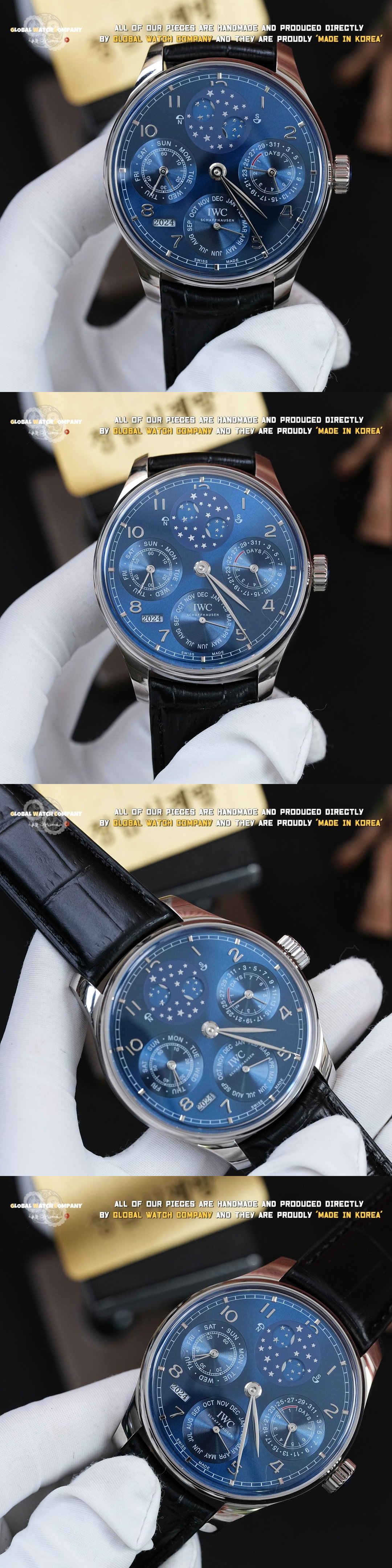 Manufacturer: Cheongdam Watch Shop v2026 Product Name: Portugieser Perpetual Calendar Blue Movement: Highest-quality modified automatic movement currently available Glass: Sapphire crystal glass (scratch-resistant) * Shipping schedule may change depending on manufacturer completion timing * * Please do not compare with cheap low-quality factory products * < Product renewed by disassembling the current highest-end model > STEP 1: Full disassembly, reassembly, and low-noise rotor tuning STEP 2: Bezel flushing work and full watch surface sanding/polishing